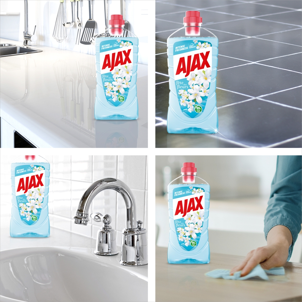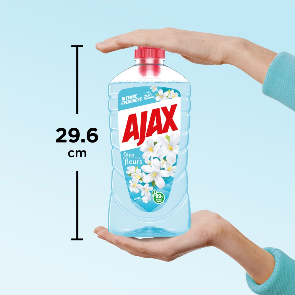 prostředek: S vůní květu jasmínu. Obsahuje esenciální oleje. Dokonale čistí a zajistí dokonalý lesk. Příjemná vůně vydrží až 24 h po úklidu. Použití Ajax čistící prostředek: Pro čistění velkých povrchů zřeďte dvě víčka přípravku na půl kbelíku vody.