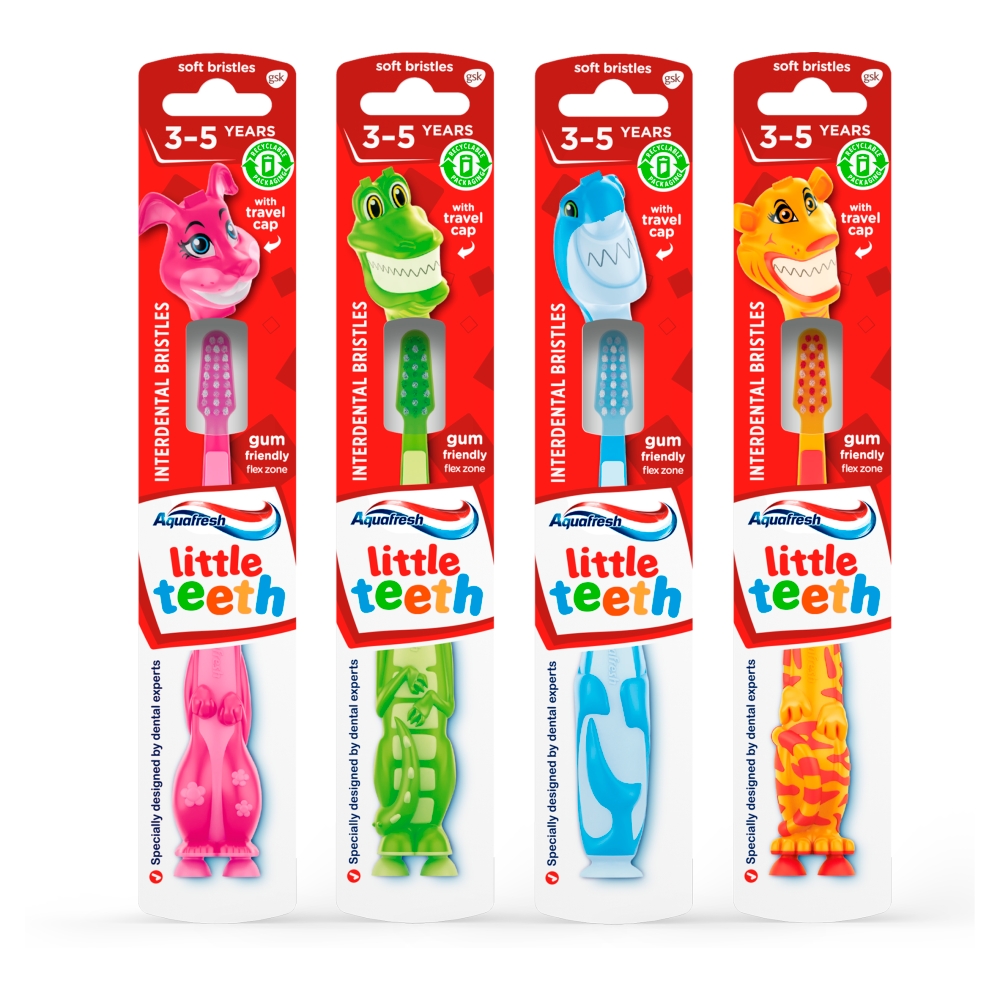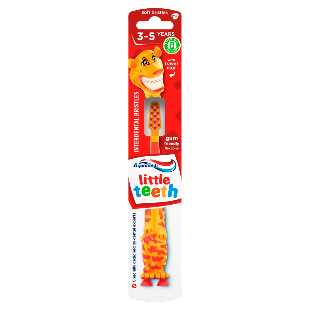 Zubní kartáček Aquafresh Little Teeth Soft je kartáček pro děti s jemnými vlákny. Zubní kartáček chrání mléčné zuby a brání tvorbě zubního kazu. Dodávka je závislá na aktuální nabídce a není možné doručit konkrétní motiv. Charakteristika Aquafresh Little Teeth Soft dětský zubní kartáček: Je určený dětem ve věku 3-5 let. Má jemné štětiny, které odstraňují zbytky jídla i zubní plak. Jeho pružný krček nevyvíjí tlak na dětské dásně. Tyto jsou tak chráněné před podrážděním či mechanickým poškozením. Doporučuje se, aby se zubní kartáček měnil po třech měsících. Použití Aquafresh Little Teeth zubní kartáček: Přílišné/nadměrné ohýbání krčku kartáčku může způsobit jeho zlomení. Děti do 6 let by si měly čistit zuby pod dohledem dospělé osoby. Nenechávejte děti žvýkat štětiny ani kartáček. Nevkládejte krytku kartáčku do úst. Je doporučeno měnit zubní kartáček každé 3 měsíce.