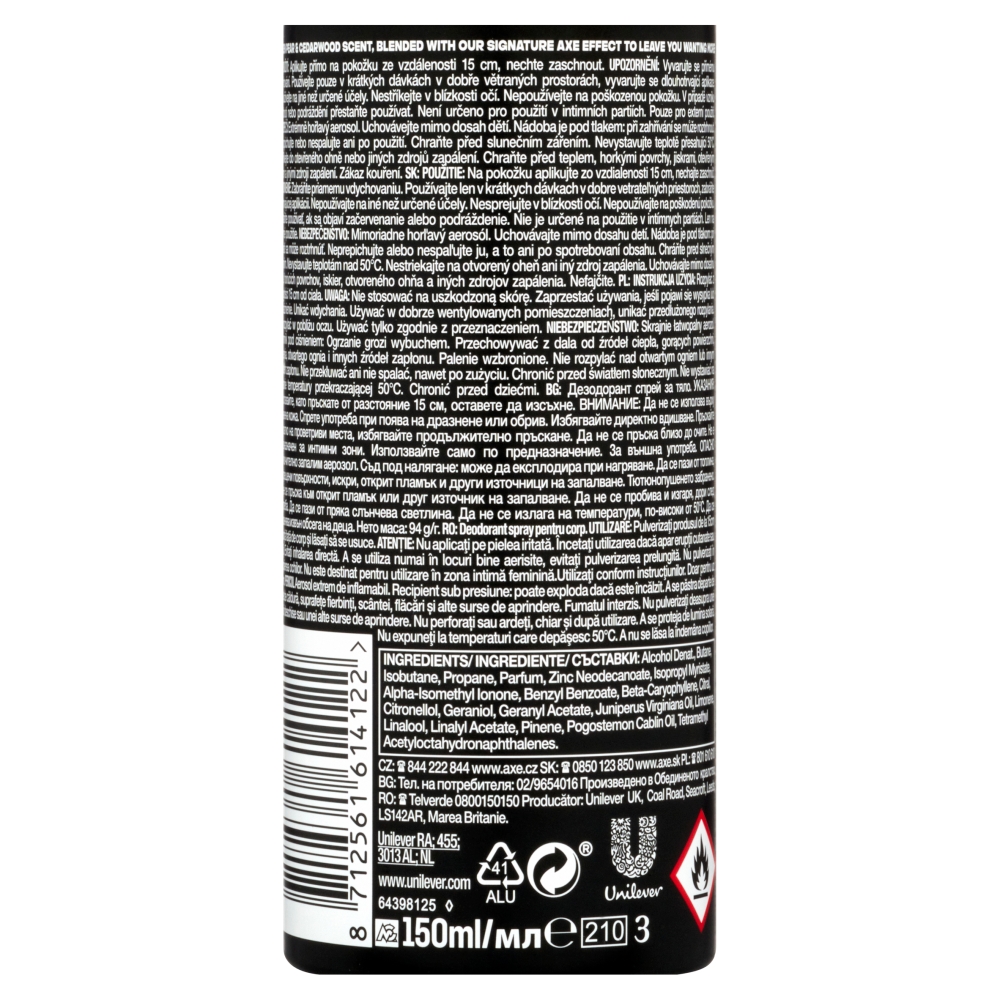 AXE Black deodorant poskytuje dlouhotrvající ochranu proti zápachu, na kterou se může každý muž spolehnout. Oblíbená vůně vyjadřuje eleganci, dynamiku a smyslnost. Vůně Axe Black se rozvine v unikátní svěžest doprovázenou nádechem šťavnatého ovoce podtrženou dřevitými a květinovými tóny. Tvůj styl je Tvůj podpis! Používej ráno do podpaží pro celodenní ochranu proti zápachu. Doporučujeme kombinovat s toaletní vodou AXE Black 50 ml a Sprchovým gelem AXE Black pro muže 400 ml.