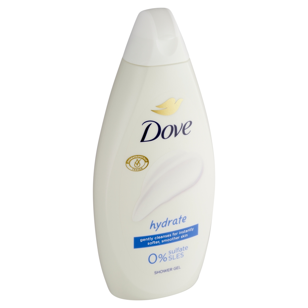 Dove hydrate sprchový gel poskytuje exkluzivní péči o pokožku díky jemným hydratačním a čistícím složkám. Tajemstvím receptury sprchových gelů Dove je obsah hydratačních složek, které se přirozeně vyskytují v pokožce a rychle se vstřebají. Zároveň obsahují jemné bezsulfátové čisticí složky, složení je tedy vhodné i pro citlivější pokožku. Už po první sprše bude pokožka vláčnější a lépe hydratovaná. Dove sprchový gel hydrate s jemnou pudrovou vůní jemně čistí pro okamžitě jemnější a hladší pokožku. Dove záleží také na udržitelnosti, všechny sprchové gely jsou veganské a certifikované PETA Vegan, 99% biologicky rozložitelné a ve 100% recyklovaných lahvích*. *bez víčka a etikety
