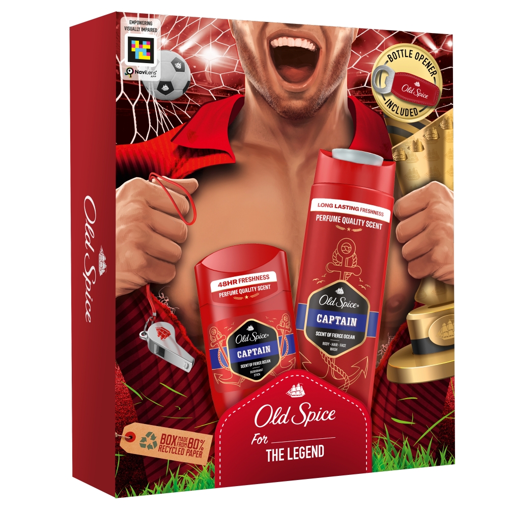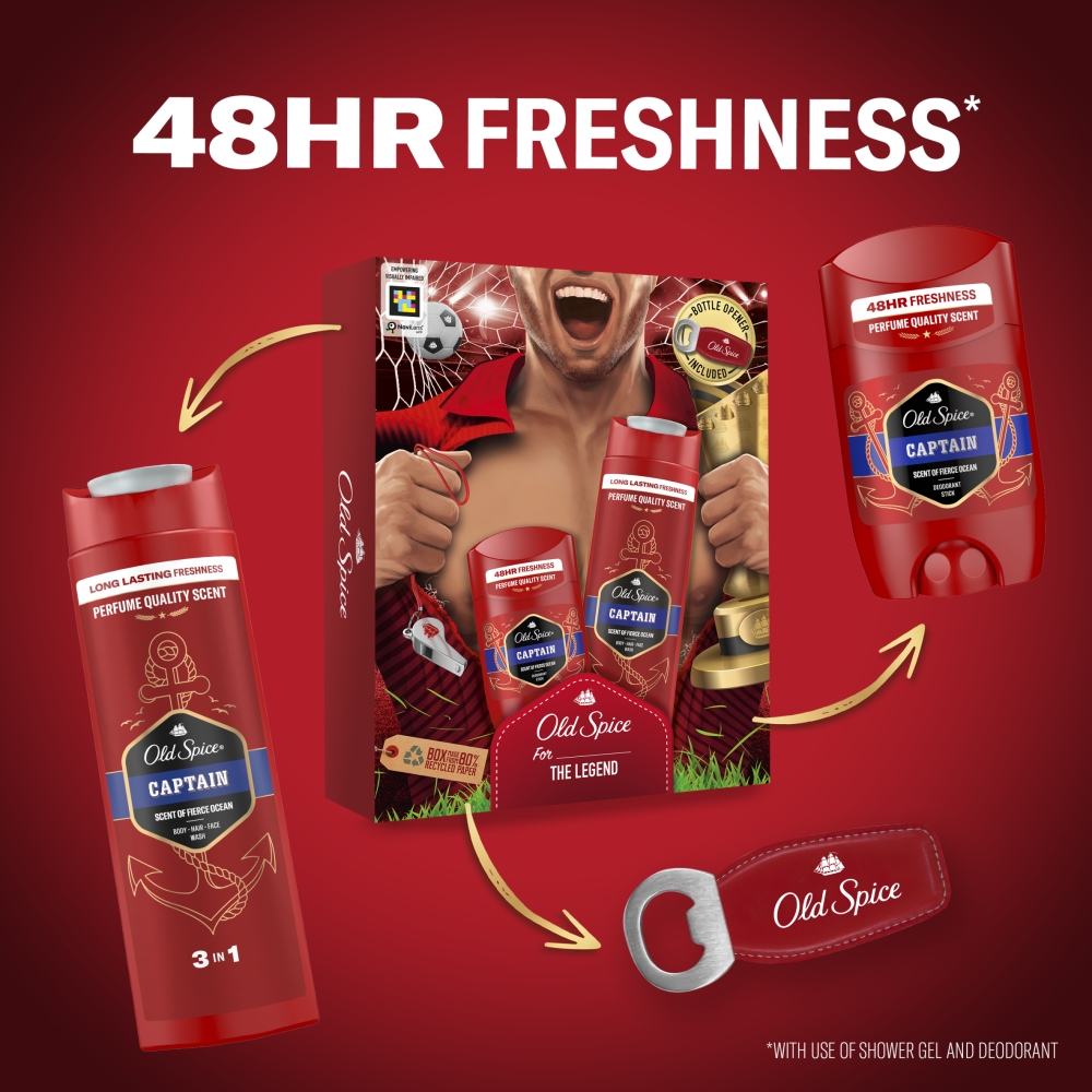Dárková sada obsahuje tuhý deodorant 50 ml a sprchový gel Captain 250 ml plus otvírák na lahve Old Spice.Další informace