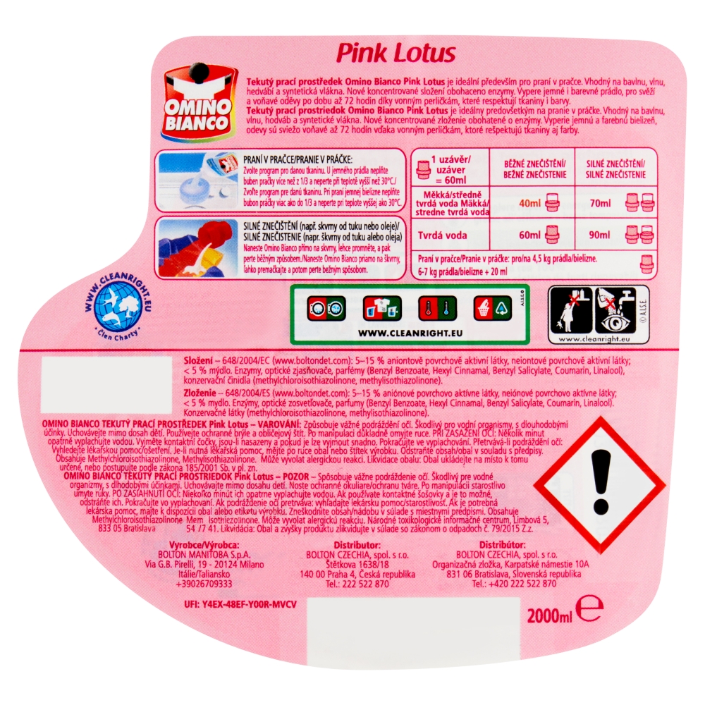 Prací prostředek Omino Bianco Pink Lotus je ideální především pro praní barevného prádla, barvy jsou po vyprání jasné, chrání prádlo před zabarvením. S novým koncentrovaným složením, které zaručuje stejnou účinnost i při nižší dávce pracího prostředku, než u předešlé řady. Proniká hluboko do vláken, respektuje vlákna tkanin, chrání barvy a zanechává svěží vůni, která vydrží po dlouhou dobu. Vhodný na vlnu, bavlnu, hedvábí a syntetická vlákna. Určený pro praní bílého i barevného prádla. Díky dermatologicky testovanému složení je vhodný pro praní prádla celé rodiny. Cena za ks.