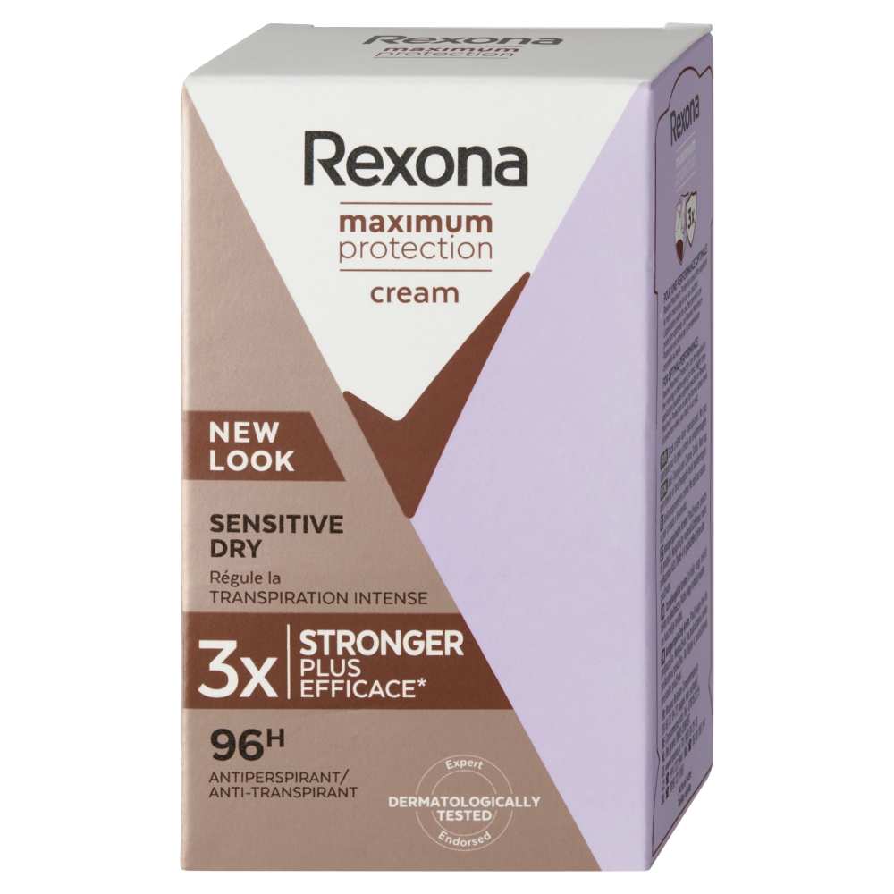 Rexona antiperspirační krém maximum protection Sensitive Dry je ten nejúčinnější antiperspirant značky Rexona. Jeho krémová konzistence vám zajistí nejen snadné nanášení, ale také se postará o suchou pokožku podpaží, protože vsakuje přebytečný pot. Pro dokonalý výsledek a nejvyšší účinek se doporučuje použít Rexona maximum protection Sensitive Dry antiperspirační krém večer, protože v době odpočinku potních kanálků může být aktivní látka TRIsolid nejvíce účinná a její působení nezruší ani ranní sprcha.