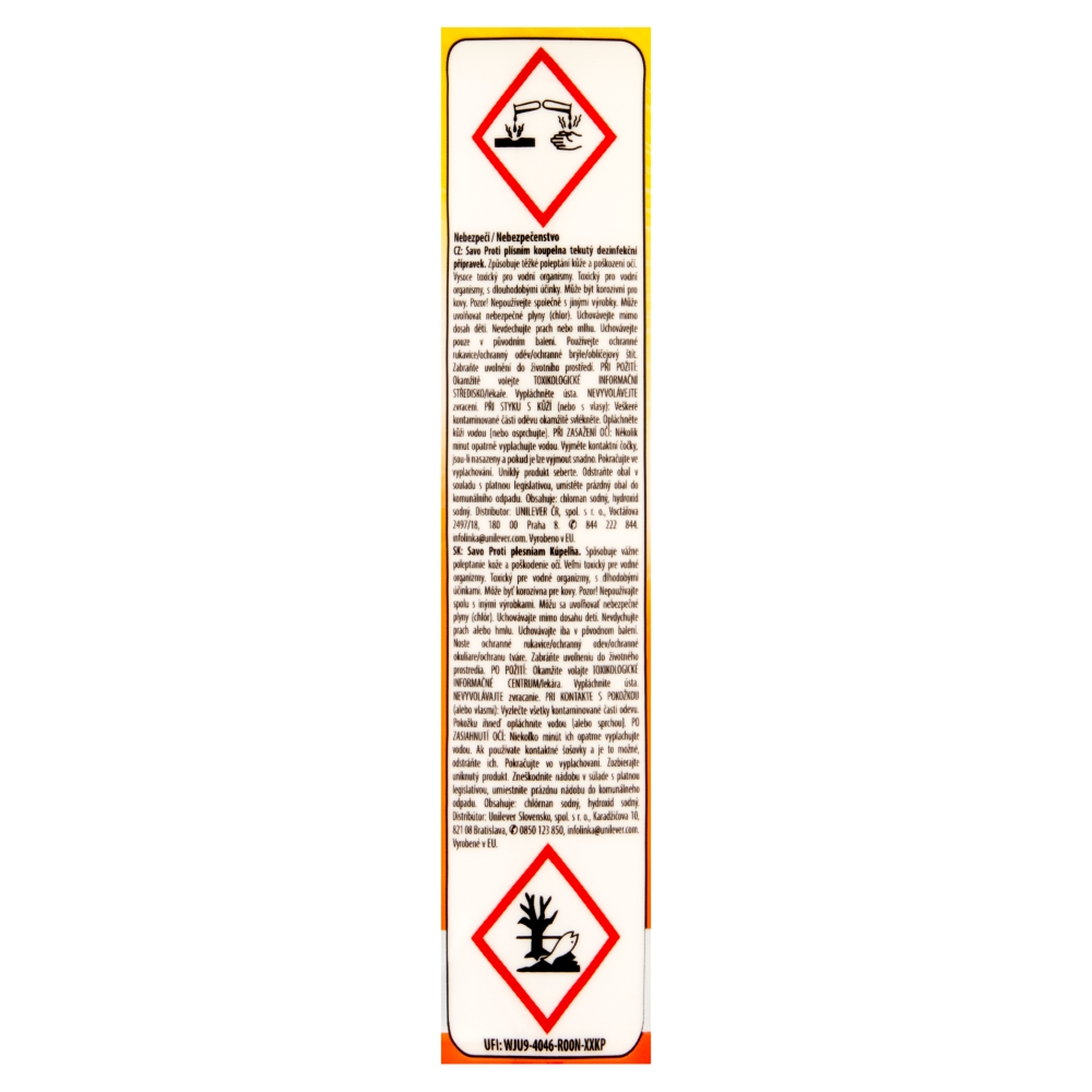 přečtěte označení a informace o přípravku. Bezpečnostní upozornění GHS05 – korozivní a žíravé látky GHS09 – látky nebezpečné pro životní prostředí Signální slovo: Nebezpečí Obsah nebezpečných látek Chlornan sodný, Hydroxid sodný. EUH206 Pozor! Nepoužívejte společně s jinými výrobky. Může uvolňovat nebezpečné plyny (chlor). H290 Může být korozivní pro kovy. H302 Zdraví škodlivý při požití. H314 Způsobuje těžké poleptání kůže a poškození očí. H318 Způsobuje vážné poškození očí. H319 Způsobuje vážné podráždění očí. H400 Vysoce toxický pro vodní organismy. H410 Vysoce toxický pro vodní organismy, s dlouhodobými účinky. H412 Škodlivý pro vodní organismy, s dlouhodobými účinky. P102 Uchovávejte mimo dosah dětí. P234 Uchovávejte pouze v původním obalu. P261 Zamezte vdechování prachu/dýmu/plynu/mlhy/par/aerosolů. P280 Používejte ochranné rukavice/ochranný oděv/ochranné brýle/obličejový štít. P303+P361+P353 PŘI STYKU S KŮŽÍ (nebo s vlasy): Veškeré kontaminované části oděvu okamžitě svlékněte. Opláchněte kůži vodou/osprchujte. P305+P351+P338 PŘI ZASAŽENÍ OČÍ: Několik minut opatrně vyplachujte vodou. Vyjměte kontaktní