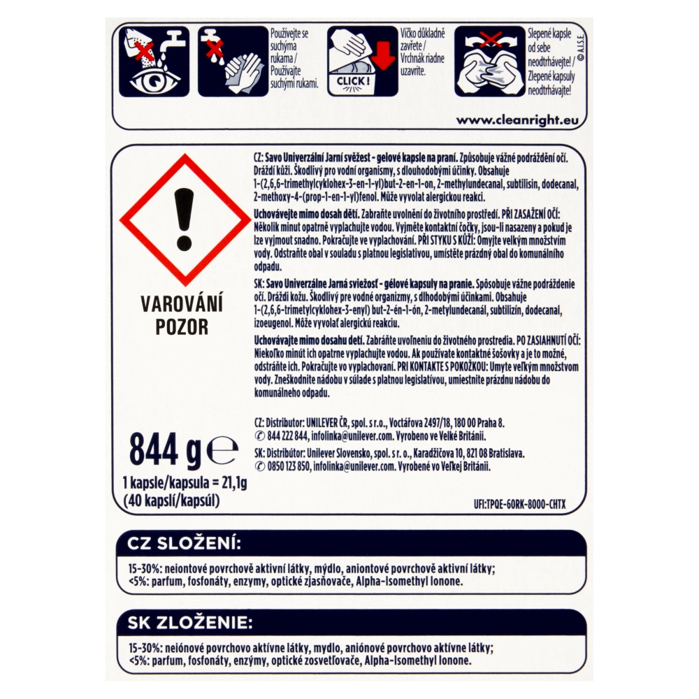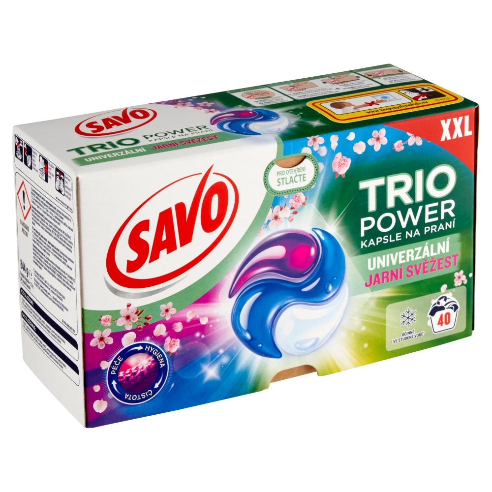 Hlavní vlastnosti kapslí na praní SAVO Trio Power Universal Jarní svěžest 40 ks Jen ta nejlepší péče o vaše prádlo Kapsle na praní SAVO jsou vytvořené na všechny typy prádla Skvěle vyperou všechny barvy prádla Velké skvrny nemusíte před praním čistit ani namáčet, kapsle SAVO si s nimi bez problémů poradí Barva prádla časem nezešedne V balení kapslí SAVO je 40 ks Výrobce tohoto produktu pochází z Anglie S…