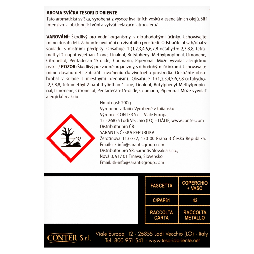 Aromatická svíčka vyrobená z vysoce kvalitních vosků a éterických olejů rozptyluje intenzivní a obklopující vůni a vytváří uvolňující atmosféru a vyrovnanost, která osvětluje smysly. Aromatické svíčky s omamnými orientálními vůněmi jsou zalité v krásných plechovkách a obsahují 2 knoty. Vhodné pro vytvoření příjemné atmosféry u Vás doma nebo jako luxusní dárek.