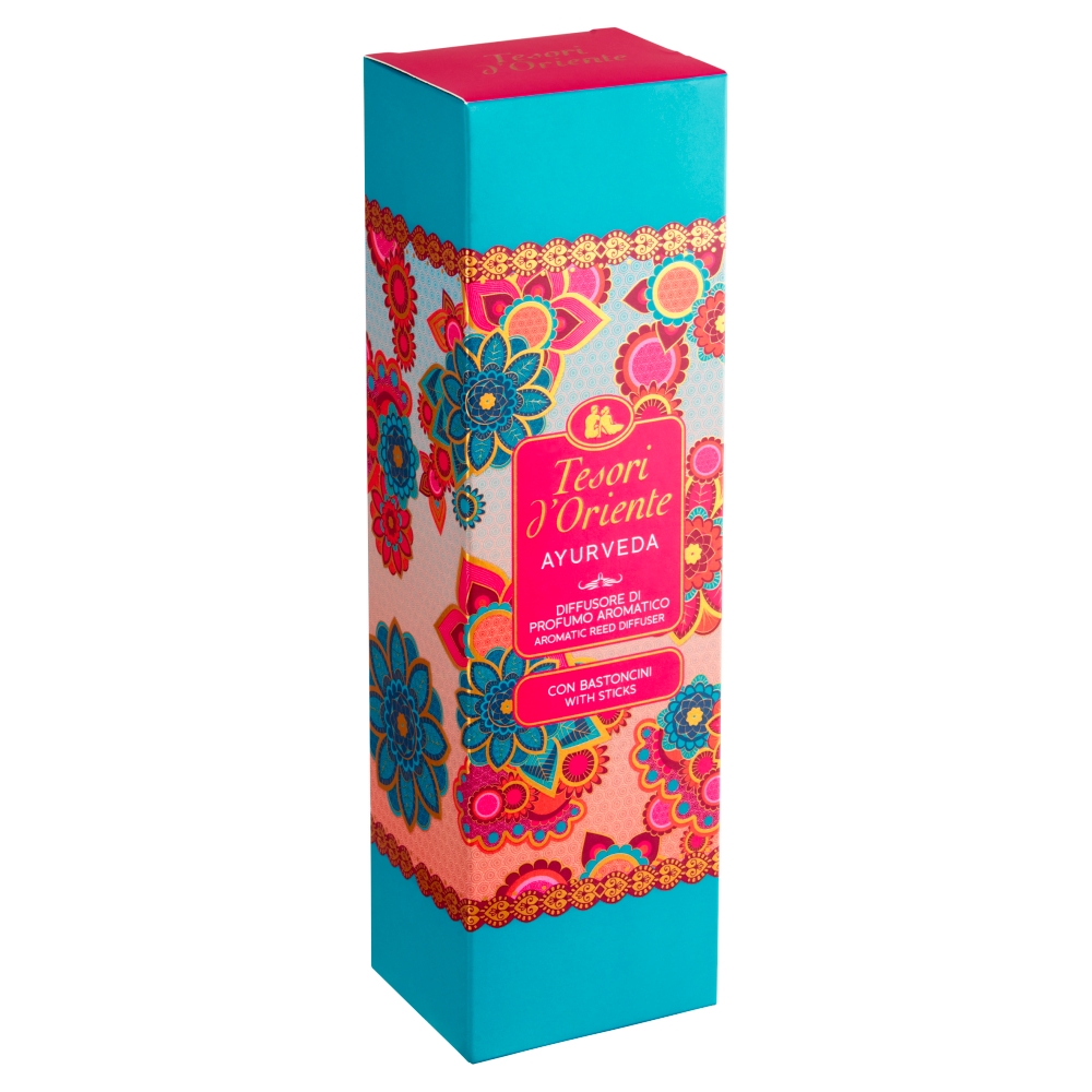 Filozofie značky Tesori d’Oriente pochází z vize, nabídnout každému možnost přeměnit každodenní rutinu a stres na očistný potěšující rituál. Nabídnout každému vůně jako ozvěny vzdálených zemí pro blaho těla i duše. Zde jsou poklady Východu. Tady je váš další výlet… Aroma difuzér Tesori d’Oriente Ayurveda představuje příjemný způsob provonění vašeho interiéru. Typická kytice voňavých tyčinek aroma difuzéru vytváří v interiéru nepřehlédnutelný dekorativní prvek. Pokud jste vyladili interiér k dokonalosti tak aroma difuzér ho naplní atmosférou. Ayurveda éterická a zasněná vůně s blahodárnými relaxačními a vyrovnávacími účinky. Sladká radost kombinuje éterické oleje z pomeranče, amly a citronu. V srdci se esence pačuli mísí s intenzivní vůní, pocitem pohody a harmonie. doba provonění: přibližně 8 týdnů dle okolních podmínekintenzitu provonění lze ovlivnit množstvím tyčinekNávod na použití aroma difuzéru:Odšroubujte kovový kroužek. Prstem odstraňte těsnění z horní části víčka. Použijte ochranné rukavice. Našroubujte kovový kroužek zpět na láhev. Vložte do láhve ratanové tyčinky a dobře je rozložte. Tyčinky budou fungovat jako knot, který bude nasávat vůni a pomalu ji uvolňovat do vzduchu. Dbejte na to, aby byl difuzér umístěn na stabilním povrchu, aby nedošlo k náhodnému rozlití náplně.Nepokládejte na naleštěné, nalakované nebo plastové povrchy. V případě rozlití náplně povrch otřete. Pro případ další potřeby tyto pokyny uschovejte. Ratanové tyčinky nezapalujte.